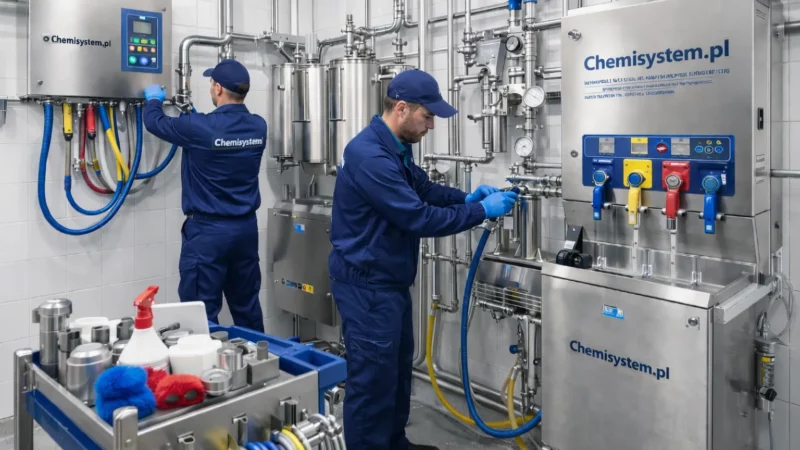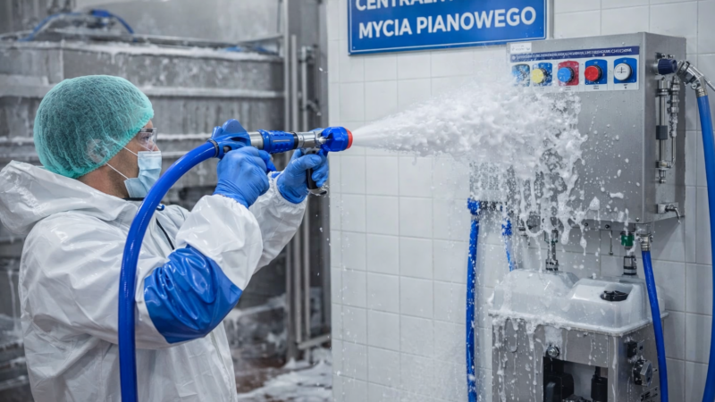 Centralny System Mycia Pianowego (CSMP) od CHEMISYSTEM to zaawansowane rozwiązanie technologiczne, idealne do mycia otwartych powierzchni, maszyn, urządzeń oraz hal produkcyjnych. System ten umożliwia wykonanie szeregu kluczowych czynności, takich jak: