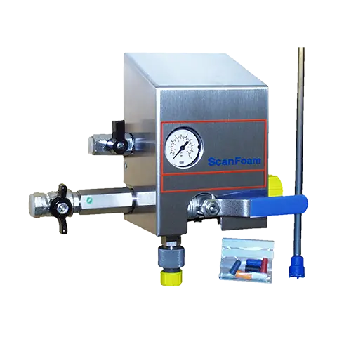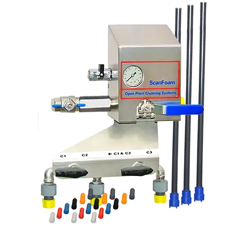 Realizowane jest to przez komplet specjalnie oznaczonych kolorami dysz, wkręcanych w króciec przyłączeniowy inżektora. Dodatkowo stacjonarny punkt mycia wyposażony jest w pokrętło regulacji ciśnienia sprężonego powietrza, (co ma wpływ na jakość piany) i manometr pokazujący aktualne ciśnienie sprężonego powietrza.